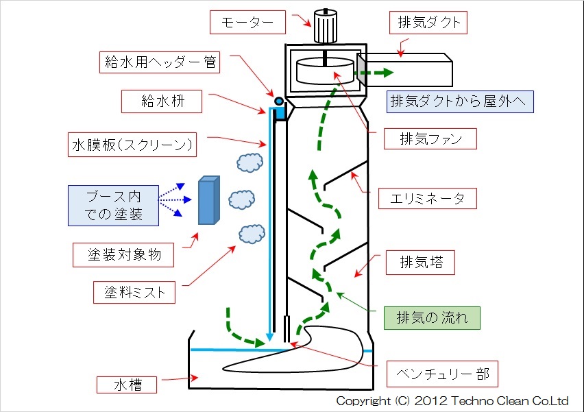 エリミネータによって、十分に塗料カスが除去できないと、排気ダクトを通じて塗料を屋外へ放出する原因となる。大気中への有害物質の拡散放出を、最大限減らす必要があります。