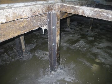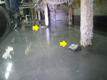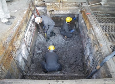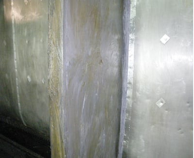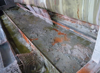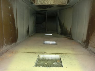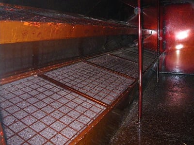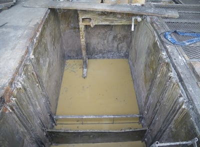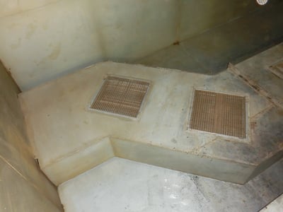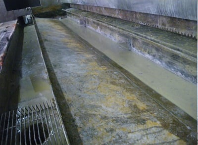 塗装ブースや、厨房(各種ボイル機類)のダクト内には、ベンチュリー部から吸い込んで溜まった水や、蒸気が溜まり、池のようになっています。