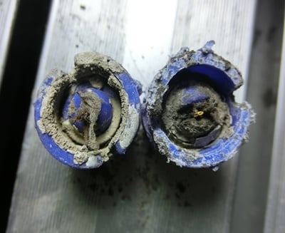 青い被覆の電線に、端子焼けを発見!ネジのゆるみによって発生した火花と熱で、被覆が溶け、端子が焦げています。