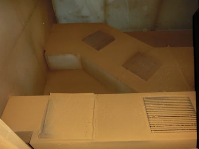 ダクトに付着した塗料カスは、排気効率や省エネの妨げになるばかりでなく、発火の危険があるため、塗装ブースおよび設備・工場全体に、ダクトを通じて延焼火災を引き起こす原因になります。