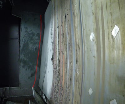 下記に紹介する工事前の水幕板も、全体が変形し、正常な水幕が作られなくなった結果、塗料が全面に付着しています。