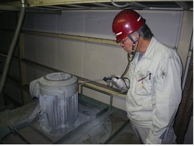 聴診器によるモーター軸受け(ベアリング)のコンディションチェック。聴いて頂くと、ベアリングの状態がよくわかります。