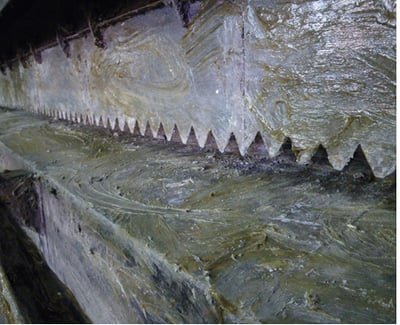 また、塗料カスを定期的に除去していないブースでは、エリミネーターが重みで垂れ下がり、破損しているケースも見られ、早急な修理が必要です。清掃後はグリスを塗布し、次回清掃の際の塗料除去がしやすくします。