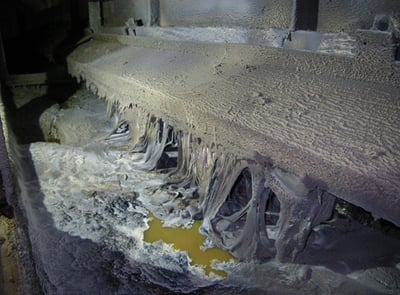 ツララのように垂れ下がった塗料カスが、ブース内の排気風速を遅くし、塗料ミストが吸い込まれなくなる結果、ワークにミストが再付着して、塗装品質の悪化を引き起こします。